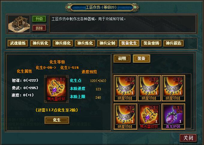 3)版本更新后,玩家可使用低品阶的装备对高品阶的装备进行化生。例如:可使用天命、真龙套装对九霄套装进行化生。