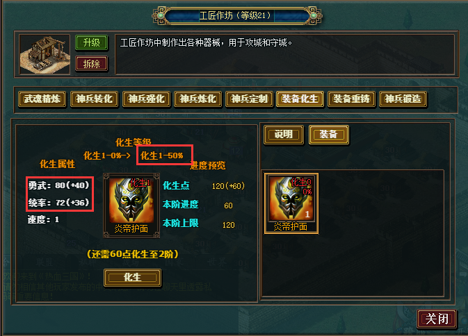 4)化生过程中,属性加成加根据当前进度百分比即时生效(速度除外)。例如下图4)中的装备,在吞噬一件蕴含60点的天命装备后,可将当前化生1的天命升级升为化生1-50%的天命,即可获得勇武+40,统率+36