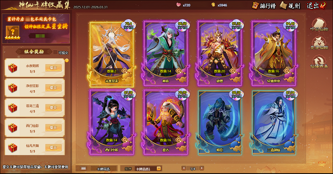 1.神仙卡牌收藏集包罗万象,集齐卡包形成组合即可领取奖励